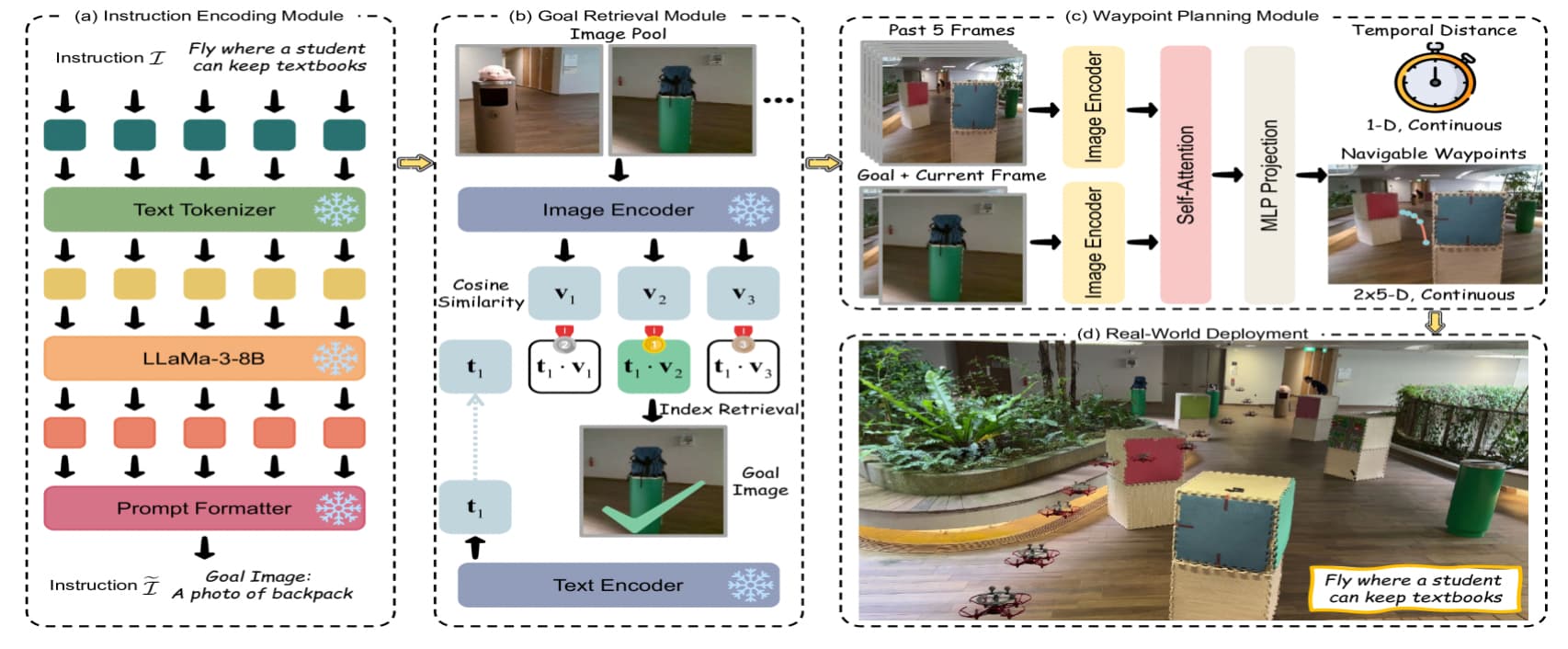 Instruction Encoding Module: This is the translator buddy. It takes your sloppy command like “Fly to the backpack near the window” and uses an LLM (think LLaMA) to spit out a clean prompt: “Goal Image: a photo of backpack.” Why? Because drones don’t speak human; they need structured vibes to match words to pics.